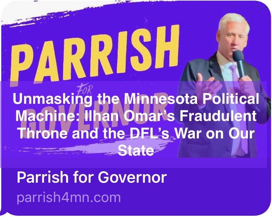 Fellow Minnesotans, this ends in 2026. As your next governor, I’ll mandate voter ID, audit every DFL-linked nonprofit, and prosecute the puppeteers from Walz to Ellison to Omar. No more sham marriages, ballot harvesting, or “Feeding Our Future” grifts starving our kids of real opportunity. Visit parrish4mn.com to join the fight. We’ve exposed the machine—now let’s dismantle it. For our state, for our children, for America.