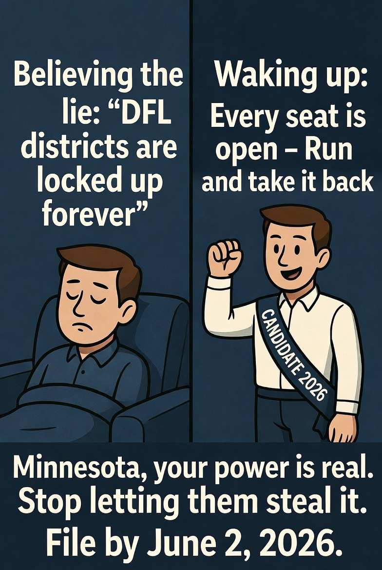 Right now, the House is razor-thin (tied or power-sharing after recent shifts and specials), and the Senate sits at a slim DFL edge (34-33). But here’s the kicker: every seat is open for challenge in 2026. No district is eternally “safe.” The DFL doesn’t own any turf; they just count on you believing they do.