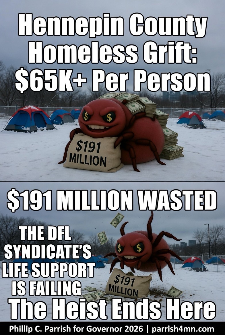 That’s over $62,000 per homeless person — a floor number. It excludes extra state grants, Medicaid looting, police/EMS responses, nonprofit overhead, and the billions Walz and the DFL machine have shoveled into the “housing continuum” since the 2023 session.
