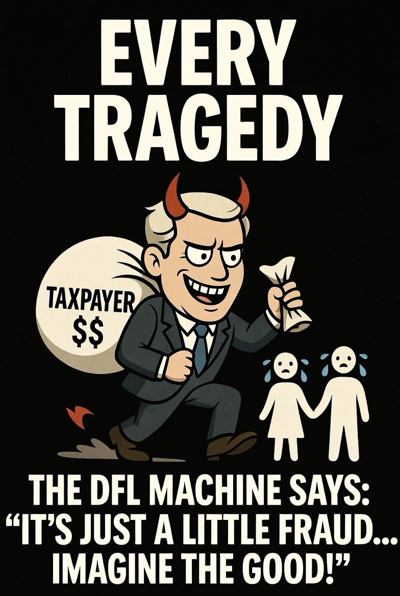 You’ll never legislate harm away. Period. Evil doesn’t vanish because you passed another 500-page bill full of loopholes designed for the connected. Harm gets worse when the people writing the rules are the same ones profiting from the chaos. The DFL machine and their nonprofit/corporate/street-level partners aren’t incompetent—they’re organized. They turn compassion into a con, tragedy into treasure, and taxpayer dollars into their personal ATM.