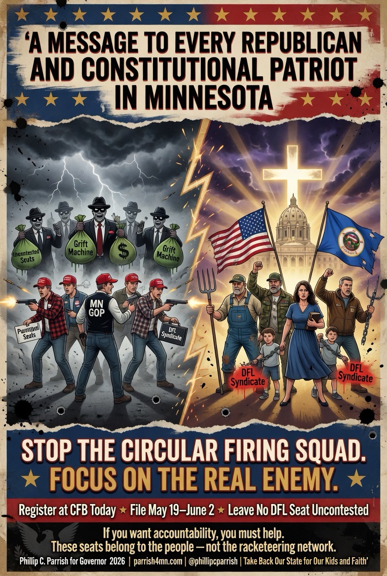 Register your committee at cfb.mn.gov today. Pick a district that currently has no opposition. File between May 19 and June 2. Drag these grifters into the light and make them answer for the fraud, the waste, and the destruction they’ve enabled.