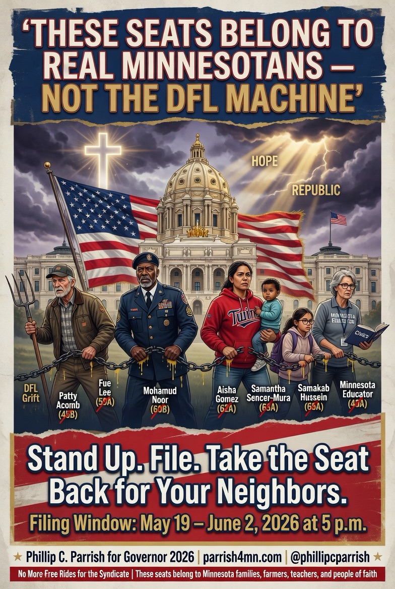 Minnesotans, the DFL doesn’t own these seats — they just act like they do because too many good people have stayed on the sidelines. These districts aren’t untouchable. They’re full of hardworking families, veterans, and believers who are fed up with the grift. All it takes is one or two patriots willing to stand up and file between May 19 and June 2.