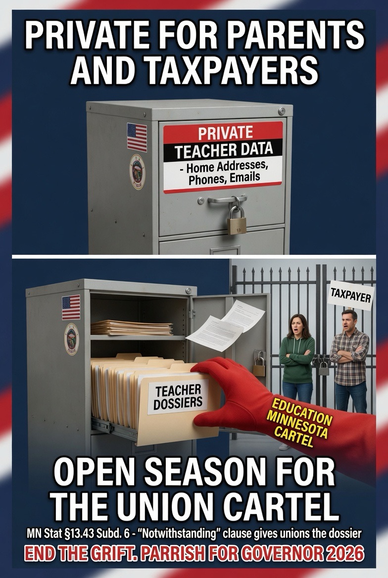 Under a Parrish administration we end the sacred-cow status for Education Minnesota and every other public-sector union racket. We repeal the “notwithstanding” carve-outs that turn private data into union weapons. We restore real local control to school boards and parents. We free teachers to focus on kids instead of union politics. We build a constitutional republic in Minnesota where government serves the citizen — not the syndicate.